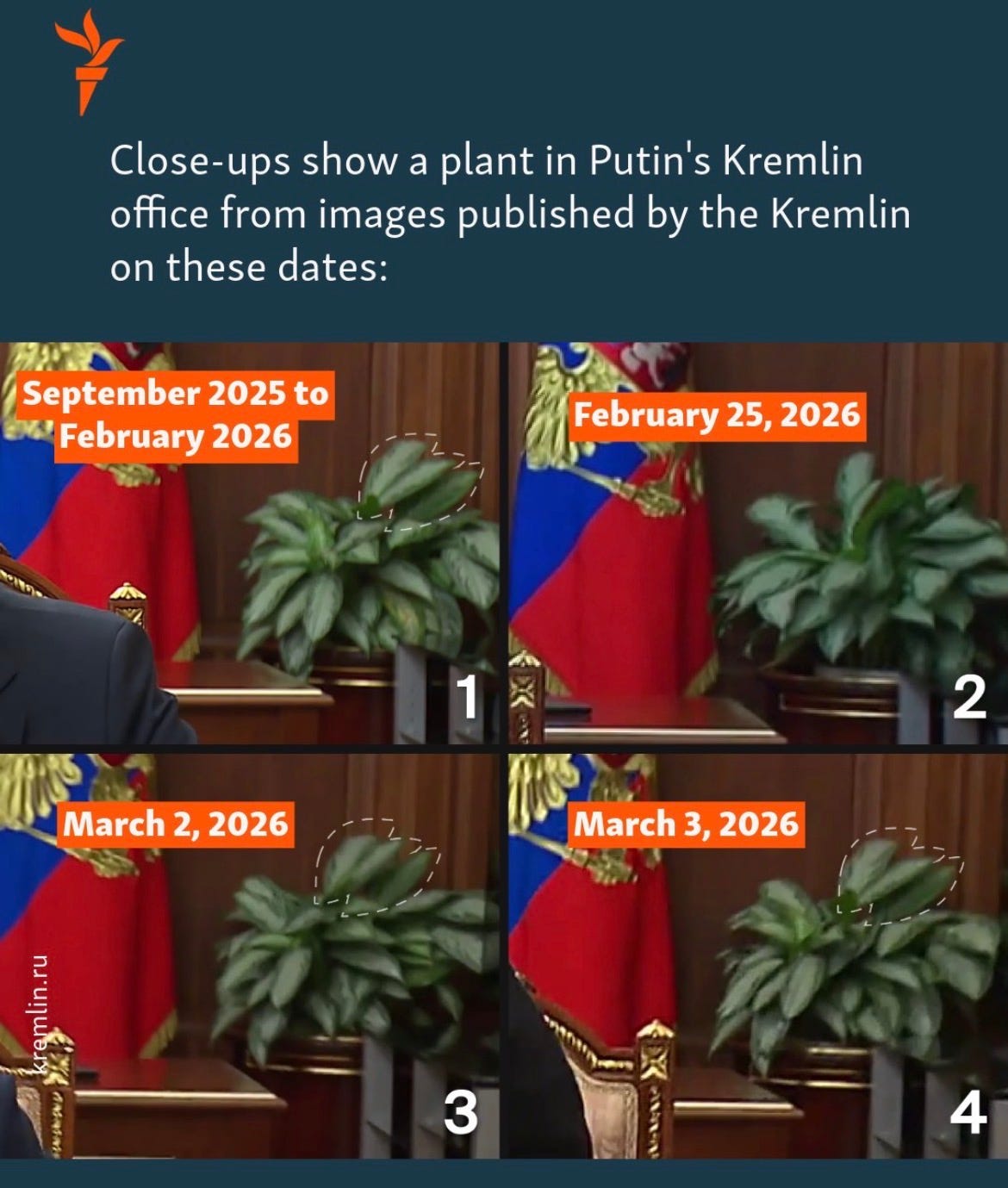 Bref, je m’éloigne du sujet. Cette fois-ci, c’est une plante verte qui a permis aux fins observateurs du web de voir que le président russe avait diffusé des images enregistrées quelques jours plus tôt lors des deux premiers jours de l’offensive américano-israélienne en Iran. Ces observateurs estiment qu’il n’était pour une fois pas question de disparaître mais de combler une nécessité communicationnelle de dernière minute, imposée par cette actualité internationale. Il s’agissait pour le chef du Kremlin de montrer à sa population qu’il était bien trop concentré sur la gestion de son pays pour se préoccuper du destin de ses partenaires étrangers.